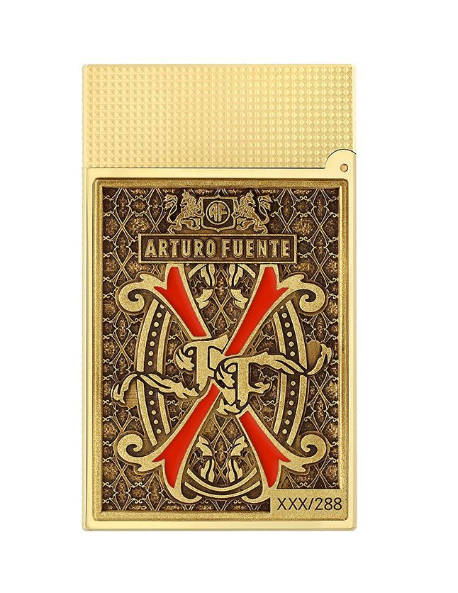 Gold diamond-pattern finish with delicate hand-crafted motifs on both front and back of the lighter featuring the Fuente Logo in Red Lacquer.