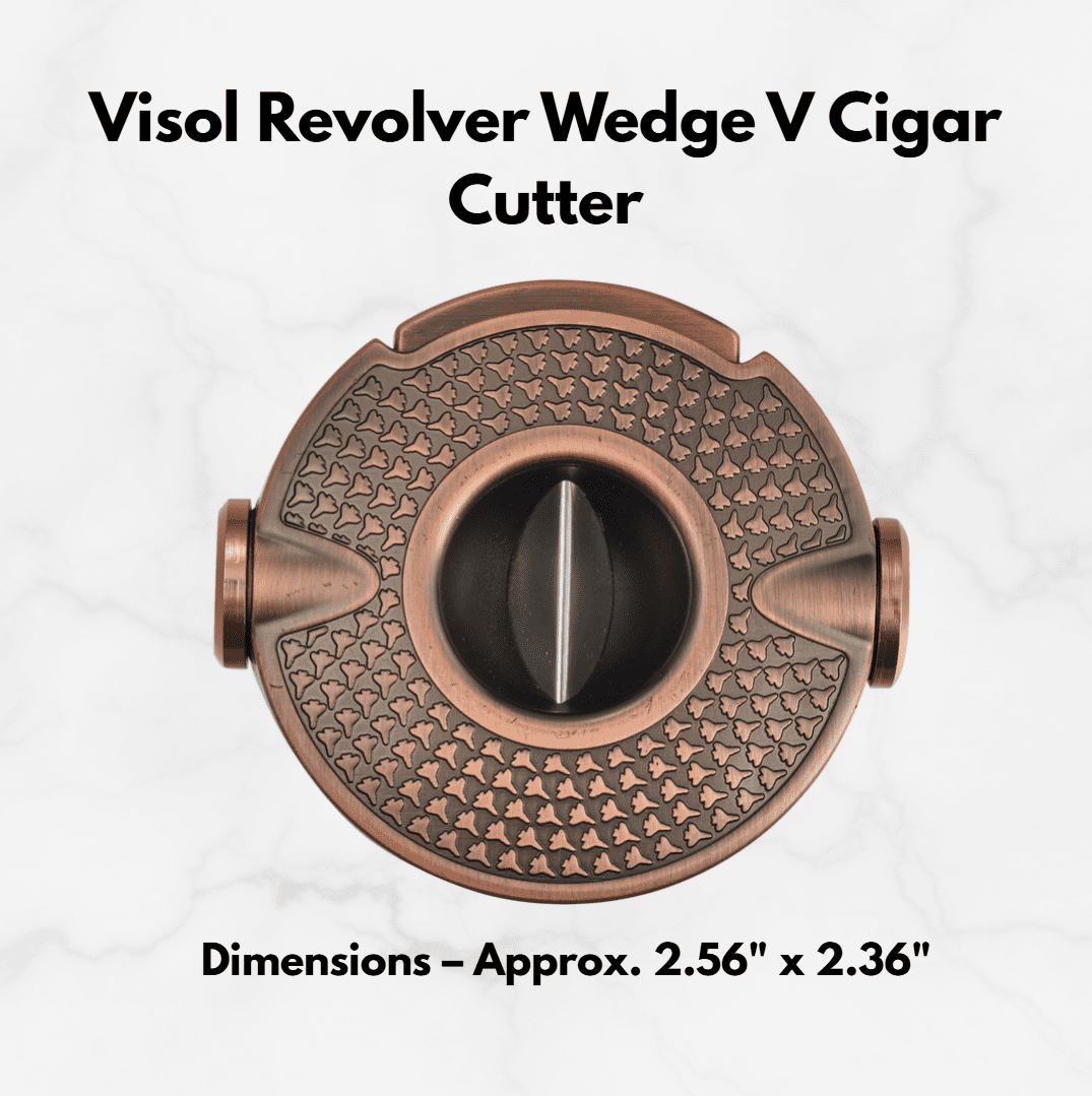 Visol Revolver Wedge V Cigar Cutter is a wedge-style V cutter designed for controlled V-shaped cuts. The wedge V blade creates a defined cut while helping maintain the cigar cap. A slide-action mechanism allows the blade to open and close smoothly for consistent operation.