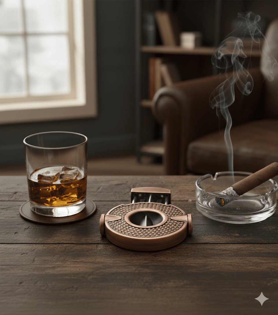 Designed to cut cigars up to a 60 ring gauge, this cutter features a solid metal body with an antique-style finish. Its compact size makes it suitable for use at home or while traveling.