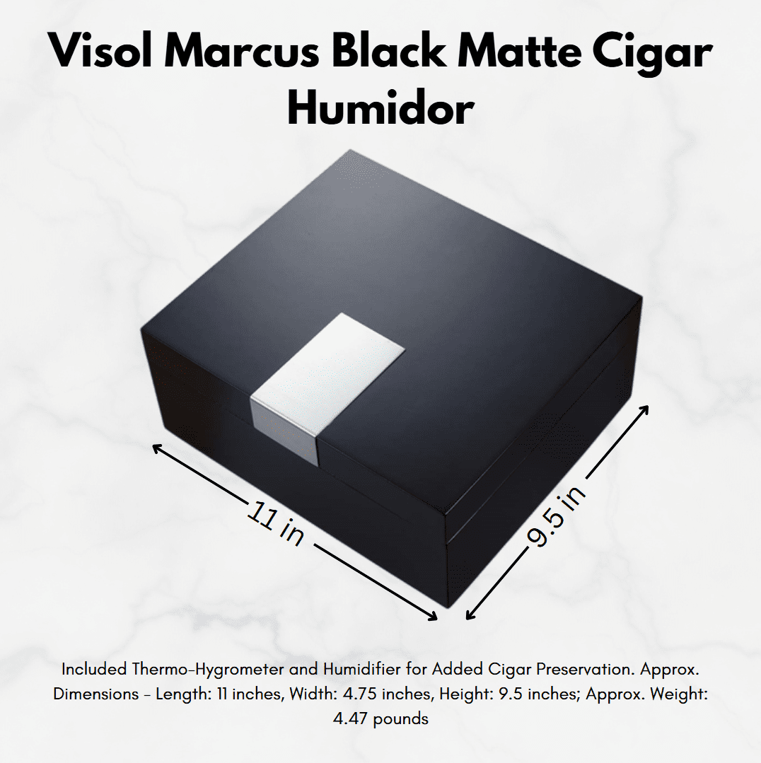 Approx. Dimensions: 11" (length) x 9.5" (width) x 4.75" (height) Approx. Weight: 4 lb., 7.6 oz. Matte Black Finish Manufacturer's One Year Warranty Arrives in a white cardboard box Holds 50 Cigars of Varying Sizes Matte Black Exterior Cedar Interior Large Engraving Plate One line of Free Engraving Cedar Divider Digital Thermo-Hygrometer Magnetized Humidifier