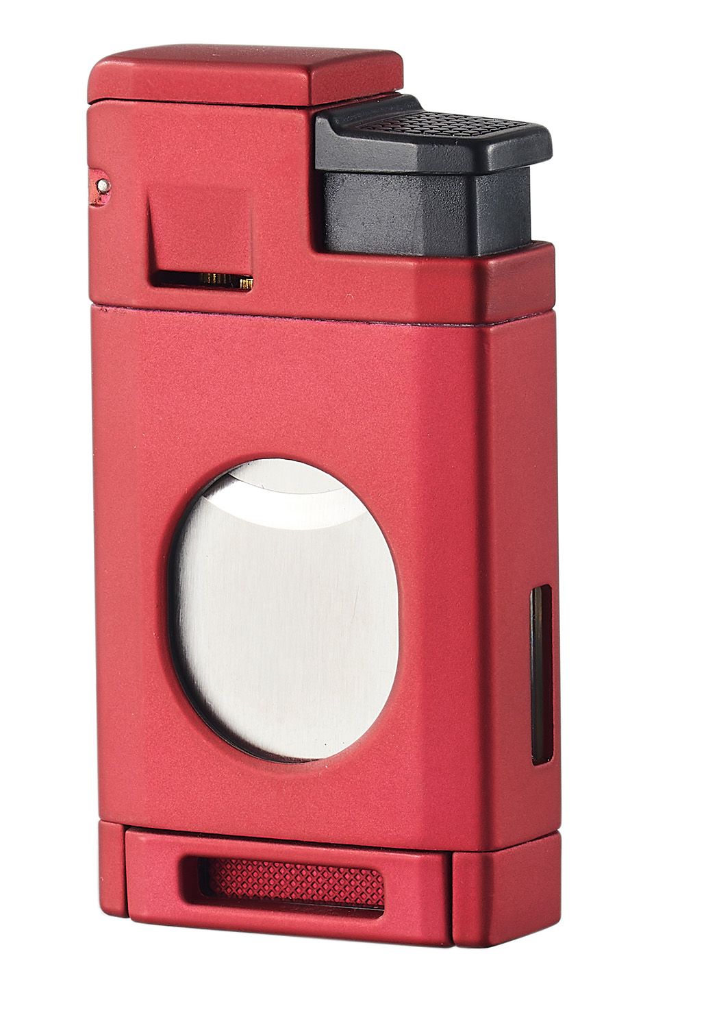 This unique lighter not only produces a powerful flame, but also has a built-in guillotine cutter on its front, capable of making an approximate 60 ring gauge cut on a cigar. Its double action ignition first releases the lid when you push down the lever, and then ignites the flames when pushed down again. There is also a butane fuel window to help you monitor your butane levels.