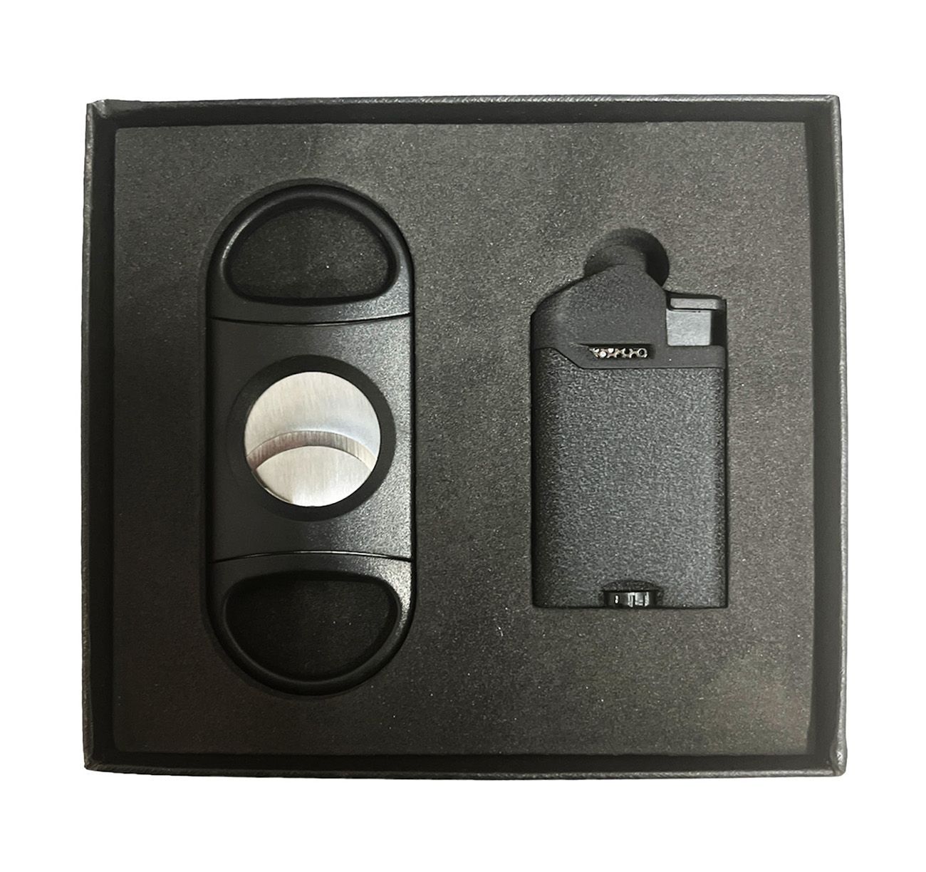 This gift set comes with the Rand Jr Double Guillotine Cigar Cutter paired with the Axis Flat Flame Cigar Lighter, both in matte black. Customize both items with a personal engraving to make it unique for you or make it special for someone else for the holidays.