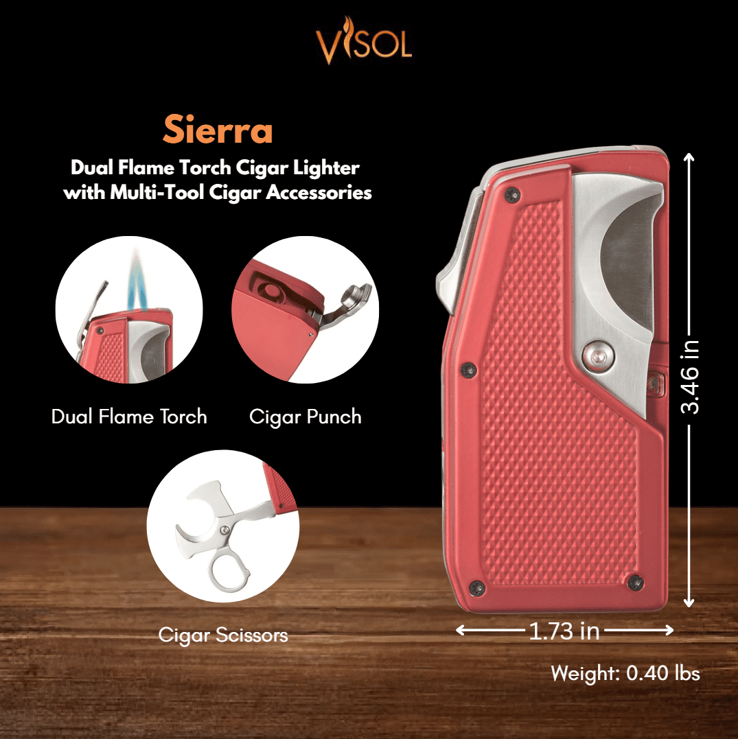 Visol Sierra Dual Torch Flame Cigar Lighter with Multi-Tool Cigar Accessories - Red