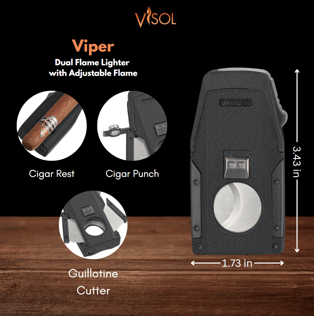 Experience simplicity and versatility with the Visol Viper Dual Flame Lighter, an all-in-one tool designed to keep everything you need in one compact piece. This lighter features two reliable torch flames that deliver a steady, even light, making it easy to enjoy your cigar anytime. Its solid metal construction offers a balanced feel in hand and is built for everyday use at home or on the go.