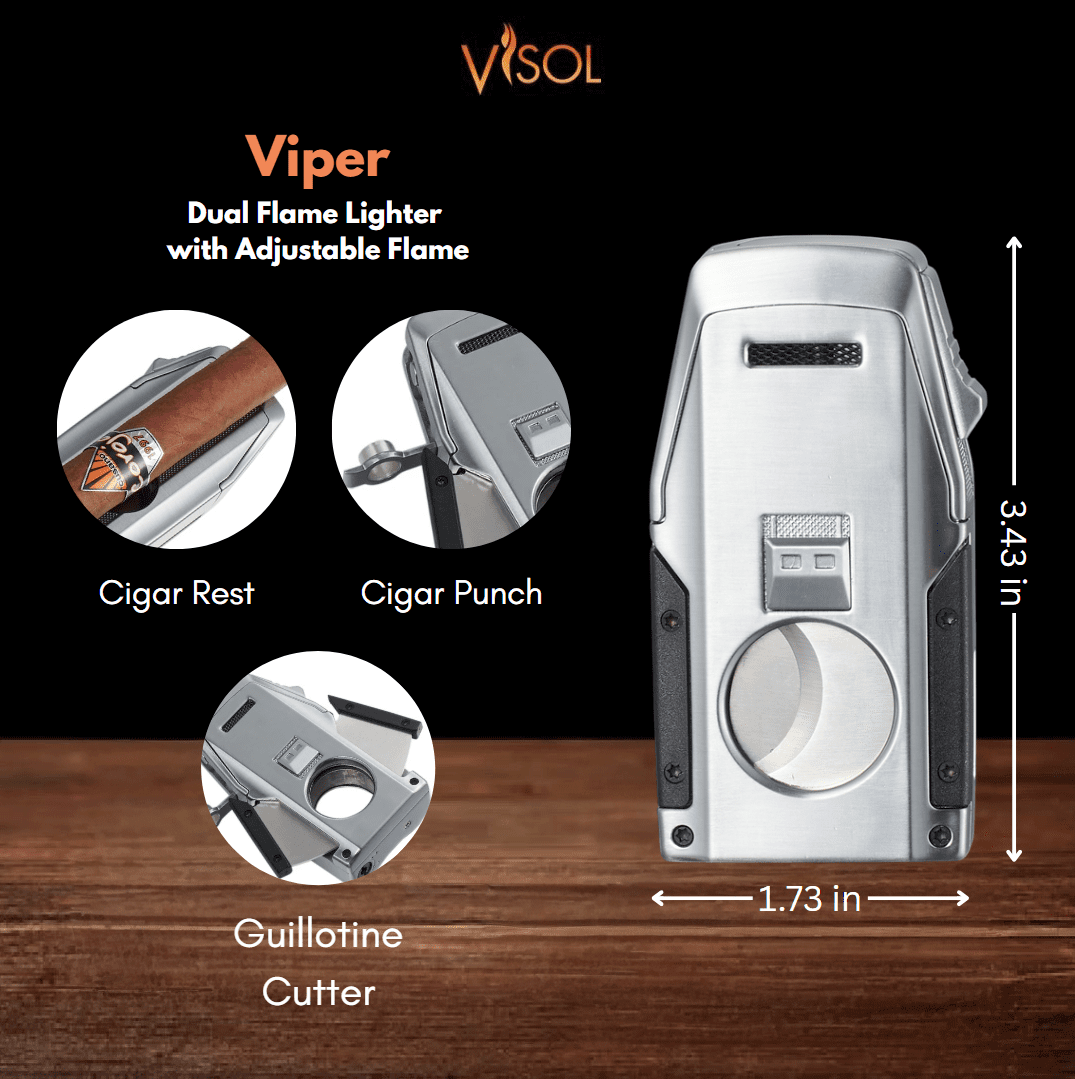 Experience simplicity and versatility with the Visol Viper Dual Flame Lighter, an all-in-one tool designed to keep everything you need in one compact piece. This lighter features two reliable torch flames that deliver a steady, even light, making it easy to enjoy your cigar anytime. Its solid metal construction offers a balanced feel in hand and is built for everyday use at home or on the go.