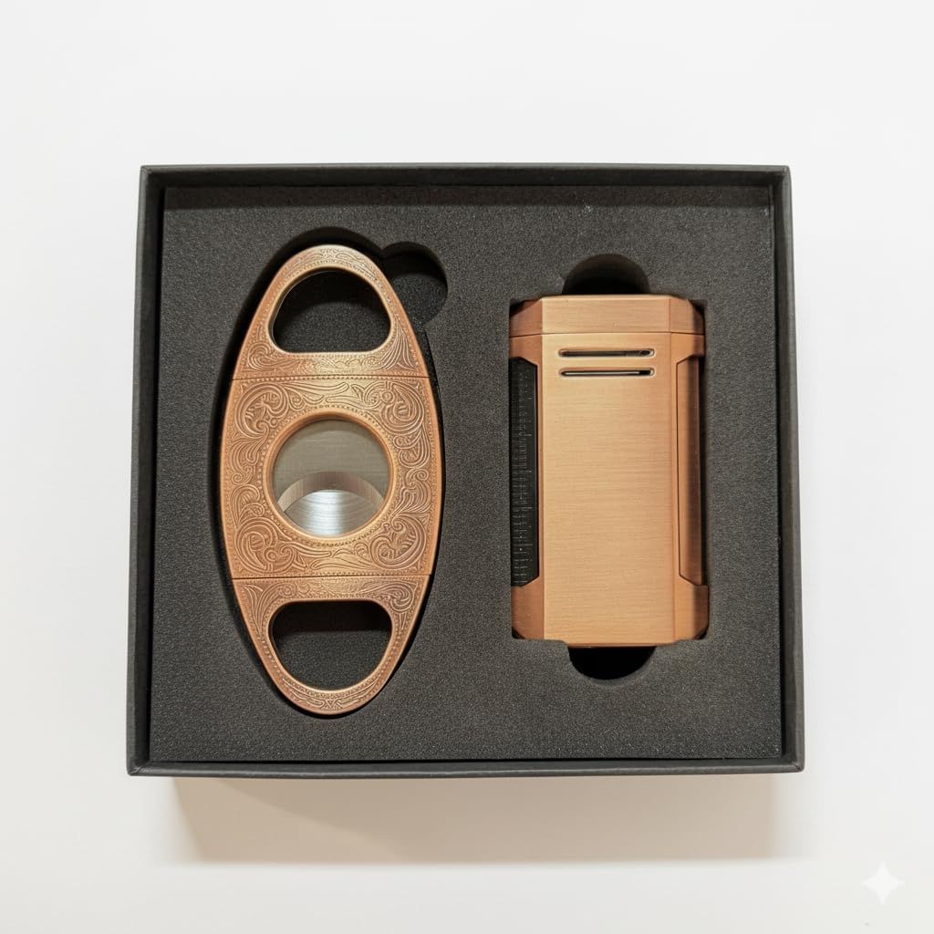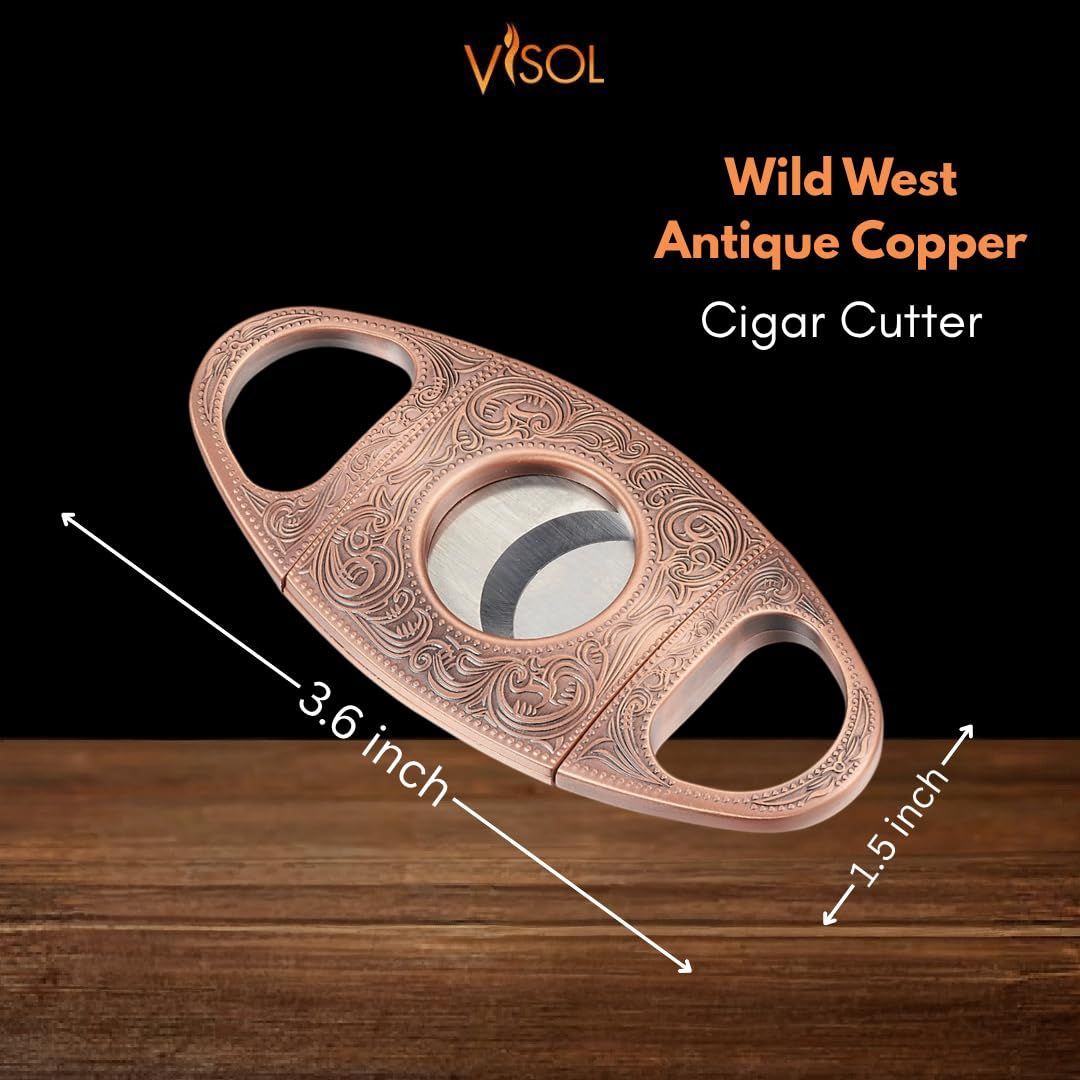 The Visol Wild West V-Cut Cigar Cutter and Vinson Torch Flame Lighter Gift Set is a premium gift for cigar lovers who appreciate both functionality and style. The Wild West cutter features a sharp V-shaped blade for deep, precise cuts that enhance the draw, finished in a stunning antique copper tone. Paired with the Vinson lighter in bronze, this flat torch flame lighter offers wind-resistant lighting and includes a built-in cigar punch for convenience.
