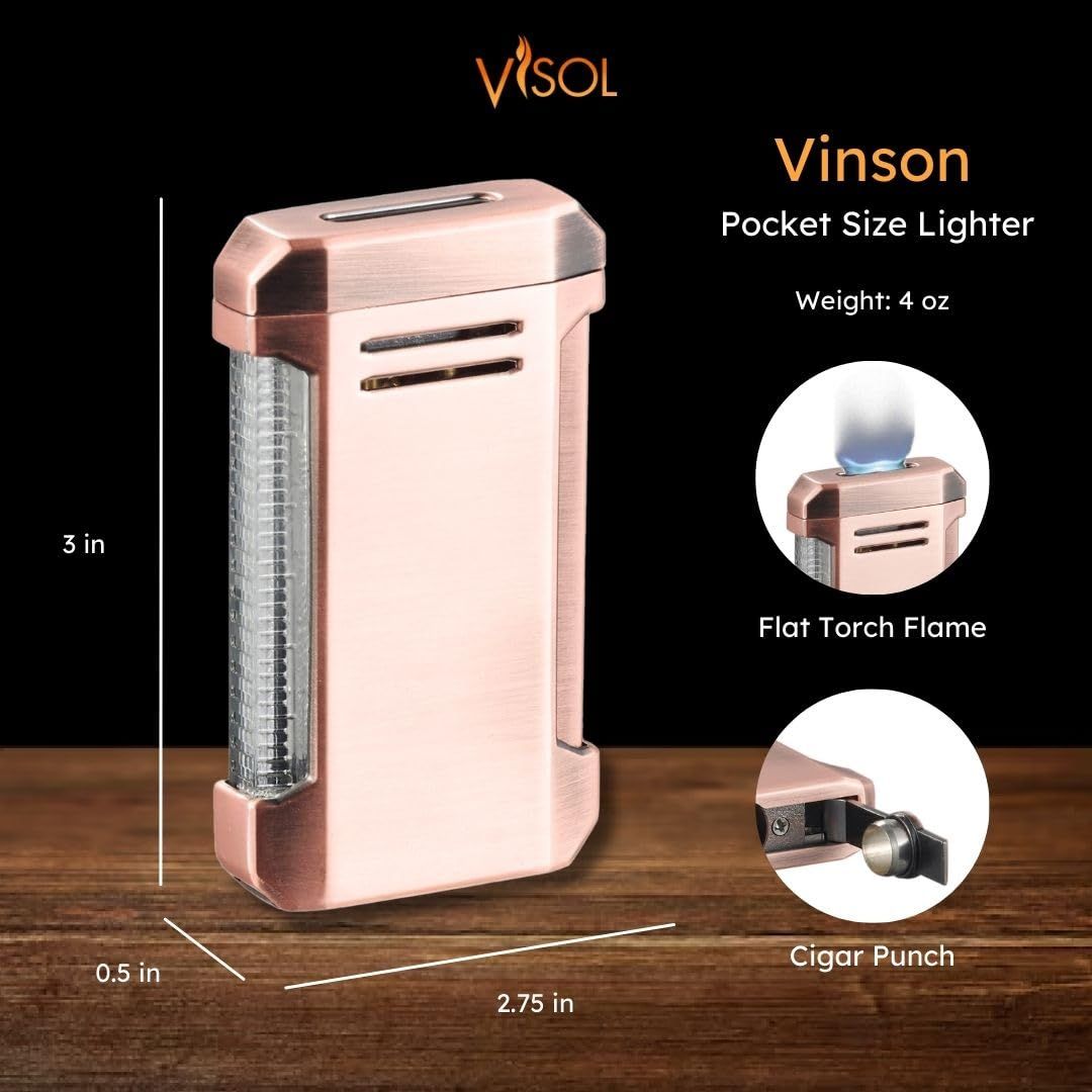 Powerful Flat Torch Flame - The Vinson lighter features a windproof, flat flame ideal for evenly lighting cigars; includes built-in cigar punch.