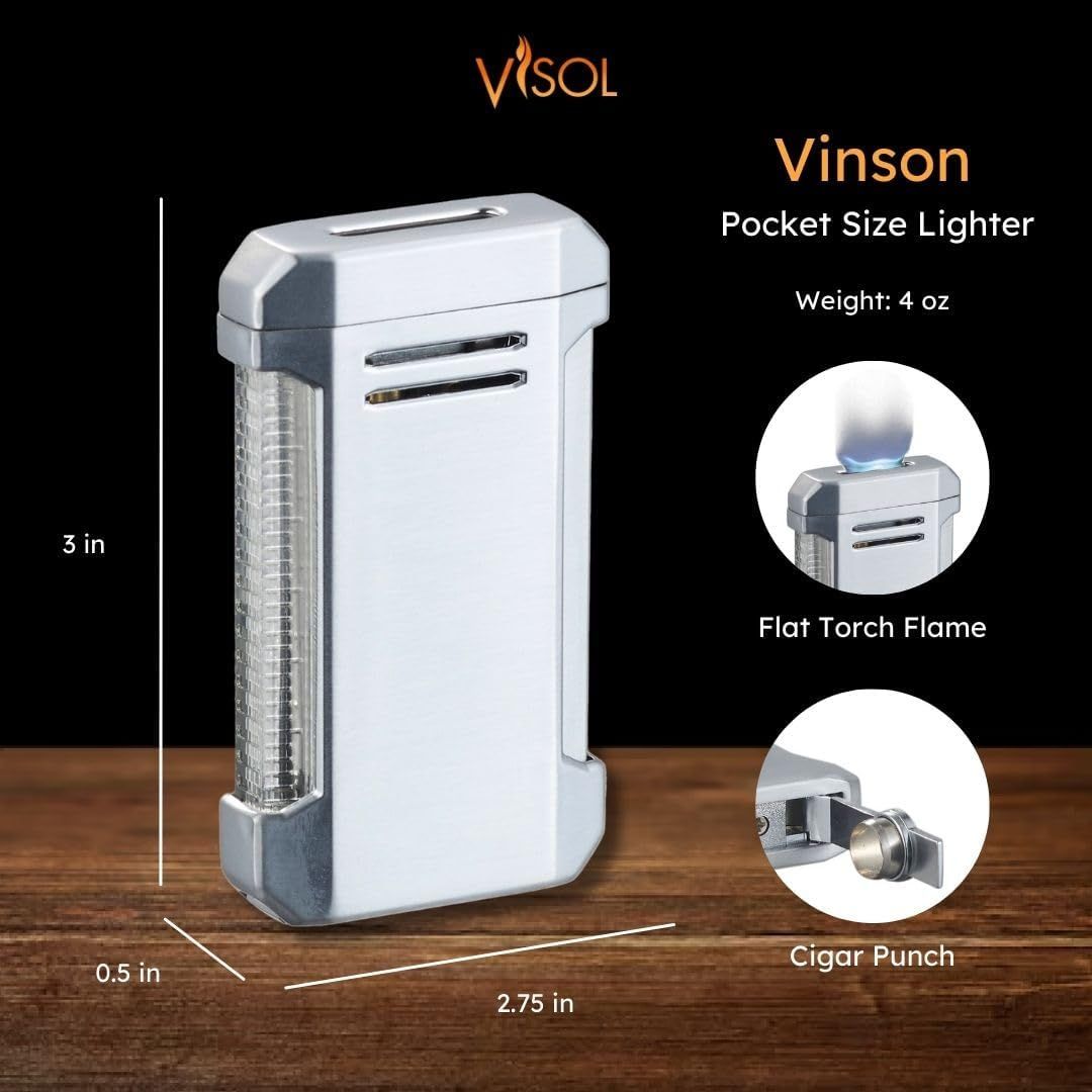 Powerful Flat Torch Lighter (Silver) - The Vinson lighter provides a wind-resistant flat flame and built-in cigar punch for all-in-one convenience.
